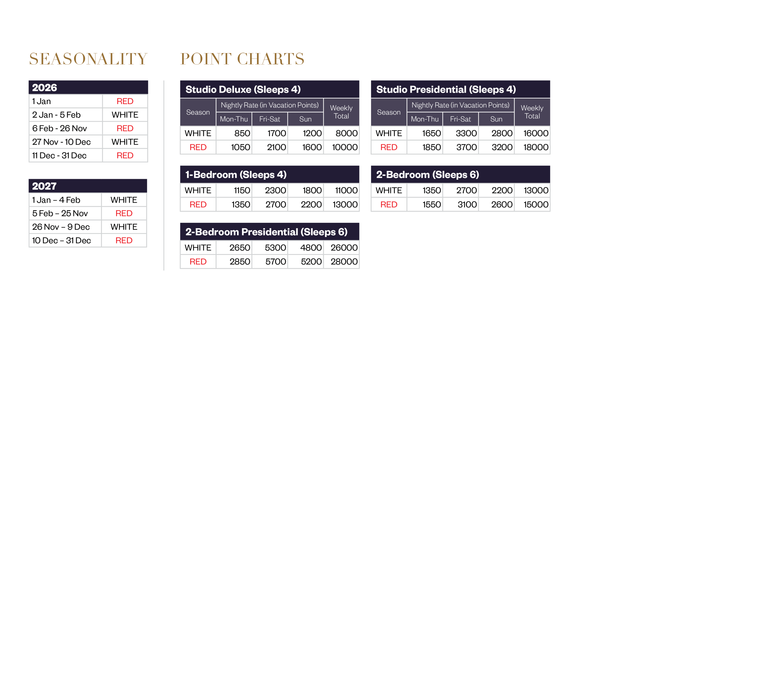 - フロントデスクの営業時間:午前7時~午後11時。フロントデスクの営業時間外にリゾートに到着する予定のオーナーは、到着前にリゾートに連絡して、代替のチェックイン手配を行う必要があります。