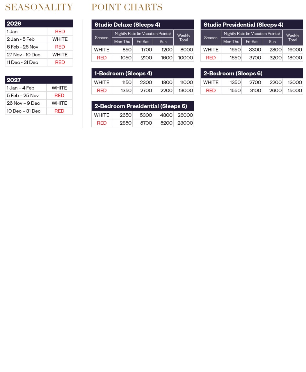 - フロントデスクの営業時間:午前7時~午後11時。フロントデスクの営業時間外にリゾートに到着する予定のオーナーは、到着前にリゾートに連絡して、代替のチェックイン手配を行う必要があります。