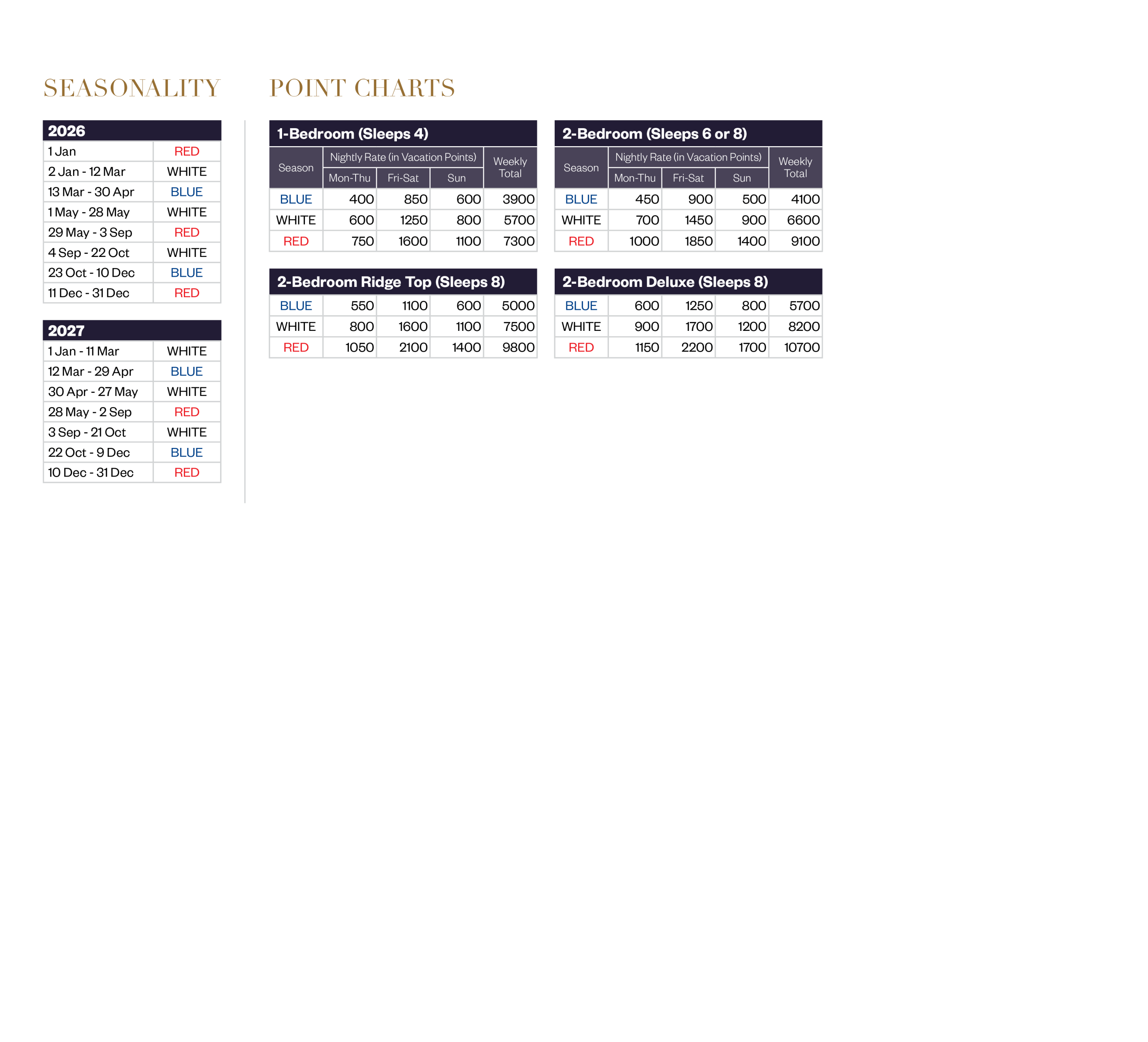 - フロントデスクの営業時間:午前7時~午後11時。フロントデスクの営業時間外にリゾートに到着する予定のオーナーは、到着前にリゾートに連絡して、代替のチェックイン手配を行う必要があります。